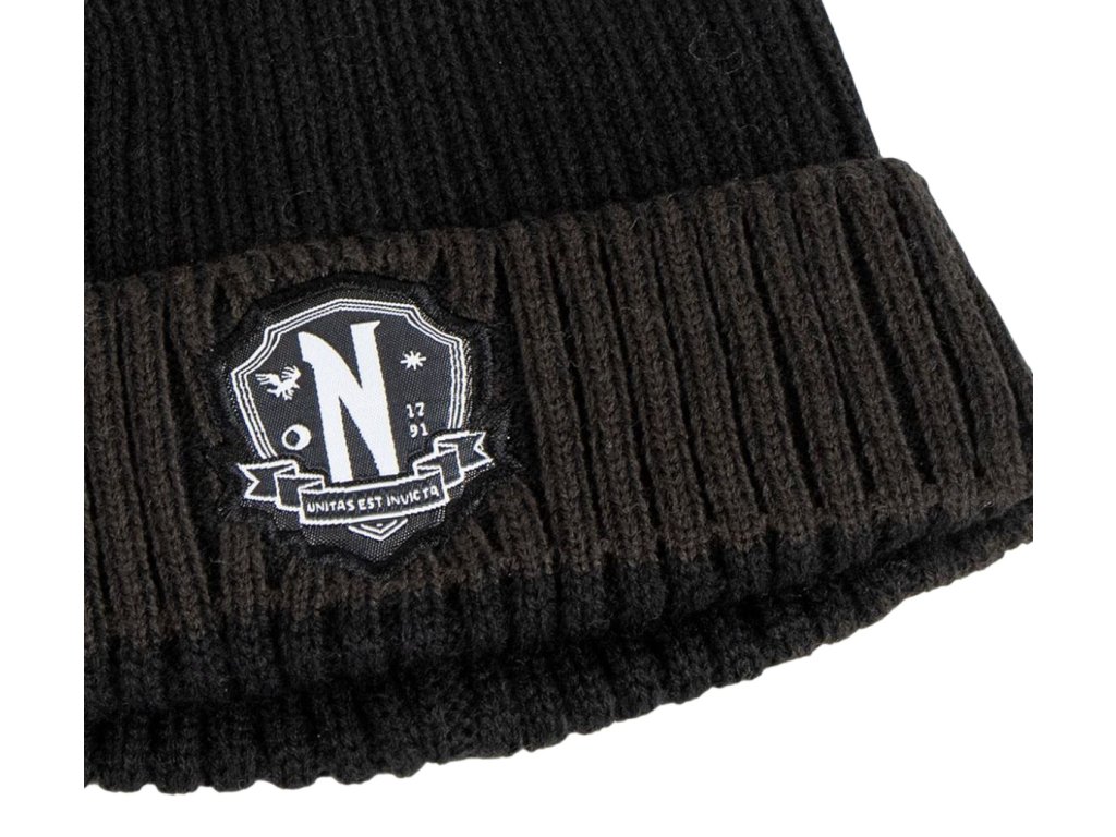 Černý atraktivní zimní set, obsahující čepici a šálu, inspirovaný siluetami postavy Wednesday a erbem Akademie Nikdyvíc z mysteriózního seriálu Wednesday pro všechny větší i menší milovníky zimy.