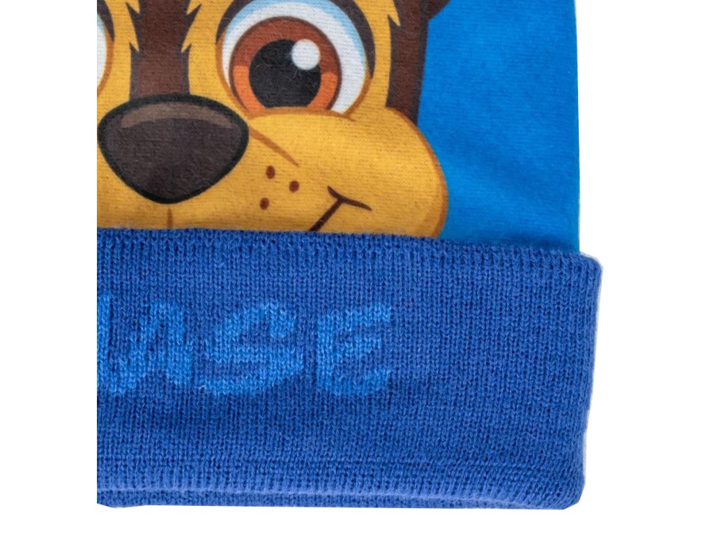 Modrý dětský zimní set s čepicí a rukavicemi s grafikou hlavního pejska Chase z Tlapkové patroly (Paw Patrol). Set je vhodným dárkem pro všechny menší i větší fanoušky, kteří chtějí pomoc Chaseovi zachraňovat město a dodržovat pořádek.
