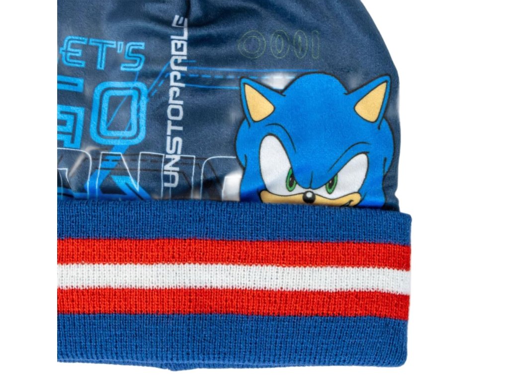 Oficiální produkt - dětský zimní set (čepice, rukavice, šátek) z katalogu výrobků s grafikou a licencí akční herní postavy Sonic the Hedgehog (Ježek Sonic).
